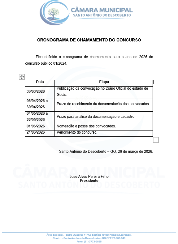 A Câmara Municipal informa à população que já está disponível o cronograma de chamamento do concurso público, etapa importante para a convocação dos candidatos aprovados.