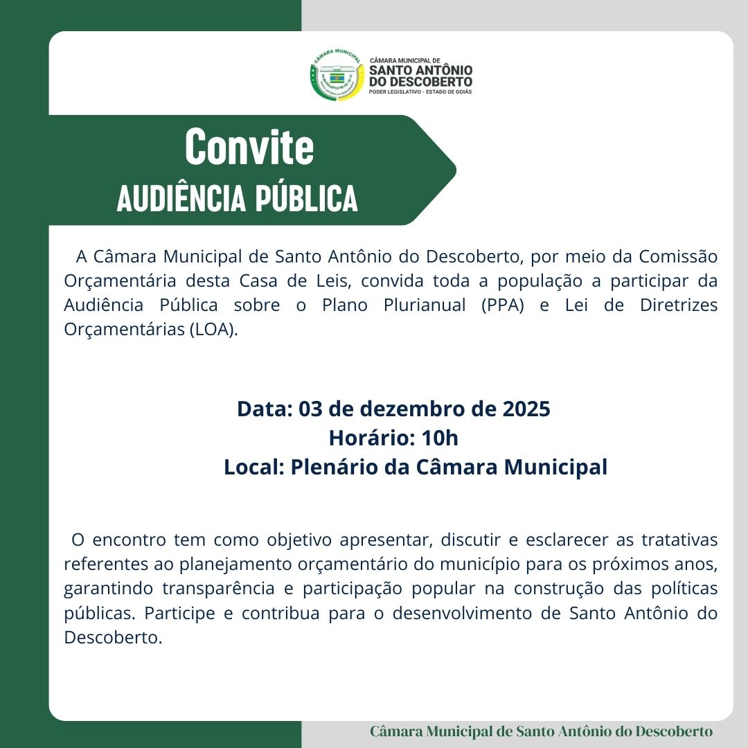 A Câmara Municipal de Santo Antônio do Descoberto, por meio da Comissão Orçamentária desta Casa de Leis, convida toda a população a participar da Audiência Pública sobre o Plano Plurianual (PPA) e Lei de Diretrizes Orçamentárias (LOA).