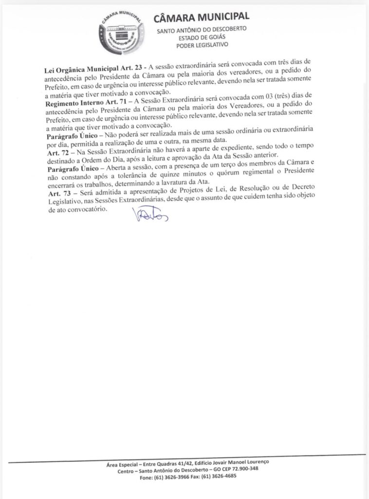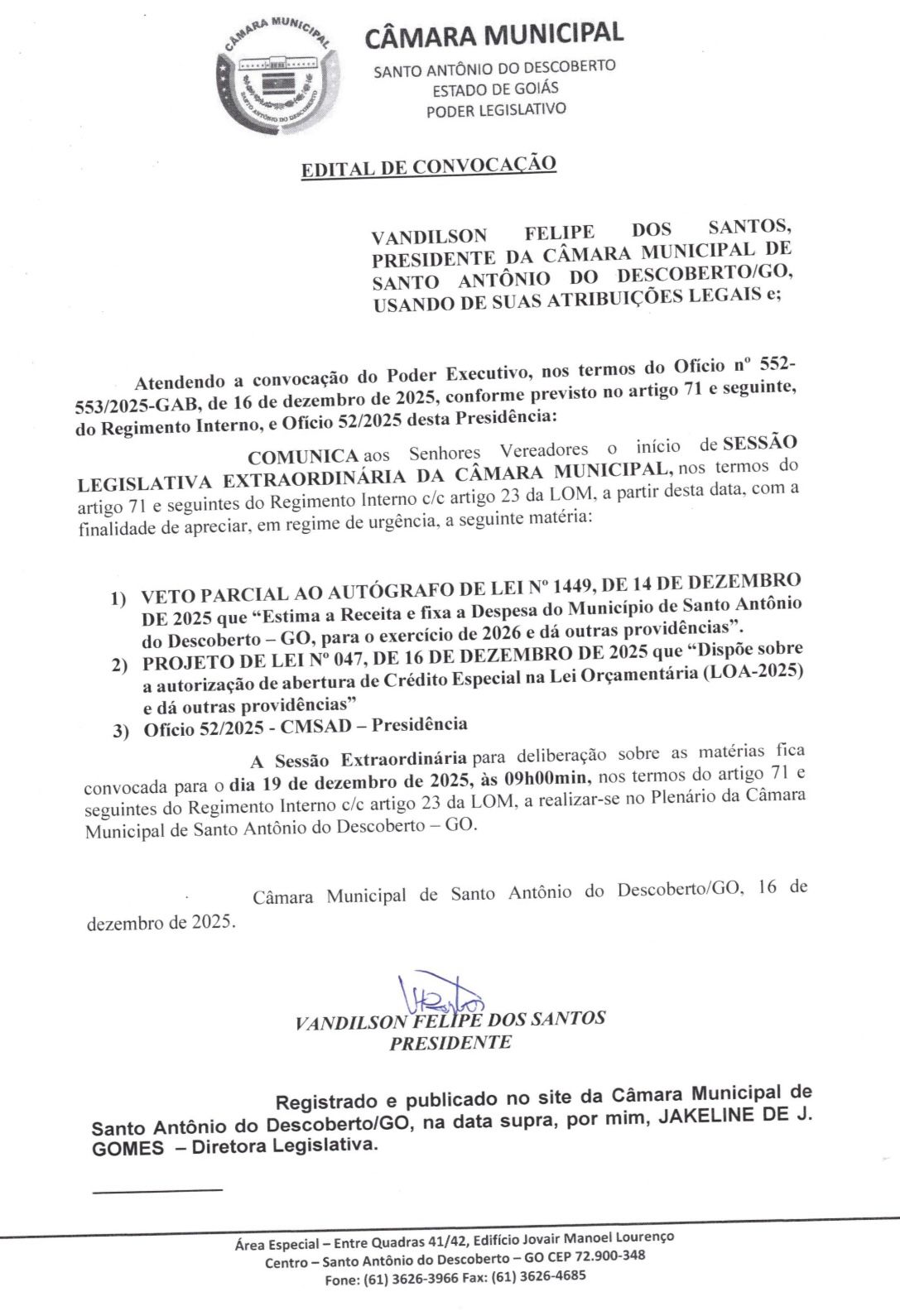 O presidente da Câmara Municipal de Santo Antônio do Descoberto, Vandilson Felipe dos Santos, convoca para a próxima sexta-feira, dia 19 de dezembro de 2025, a partir das 9h, a realização de uma Sessão Legislativa Extraordinária, no Plenário da Câmara Municipal.