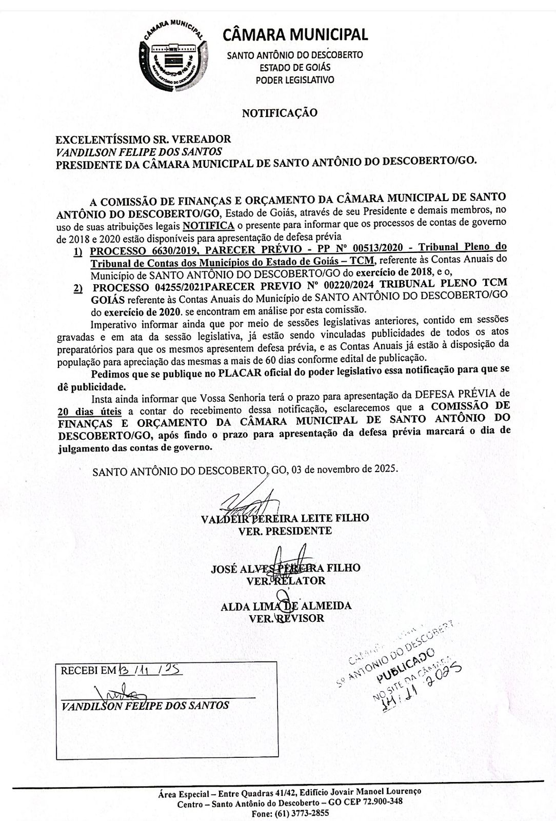 A Comissão de Finanças e Orçamentos da Câmara Municipal de Santo Antônio do Descoberto-GO, Estado de Goiás, por meio de seu Presidente e demais membros, no uso de suas atribuições legais NOTIFICA o presente para informar que os processos de contas de governo de 2018 e 2020 estão disponíveis para apresentar de defesa prévia.