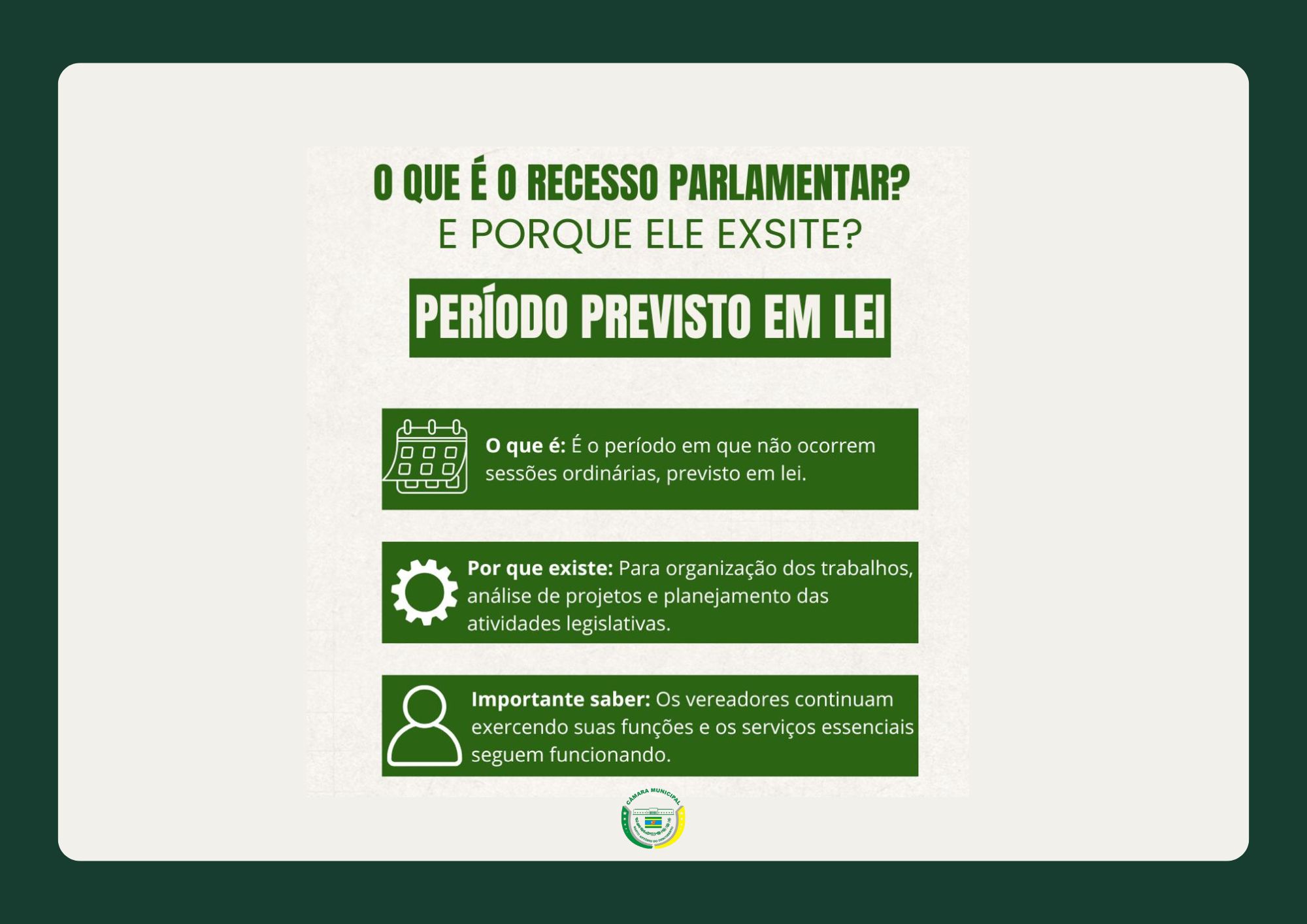 O recesso parlamentar é o período em que não são realizadas sessões ordinárias no Poder Legislativo. No entanto, é importante destacar que esse intervalo não representa interrupção das atividades da Câmara. Previsto em lei, o recesso é um momento essencial para a organização interna, o planejamento das ações e o aprimoramento do trabalho legislativo.